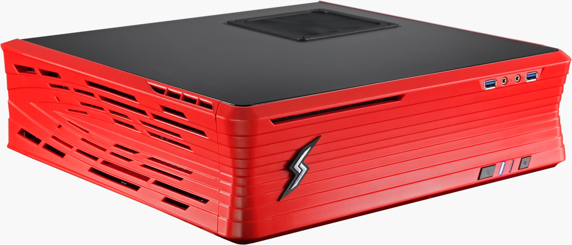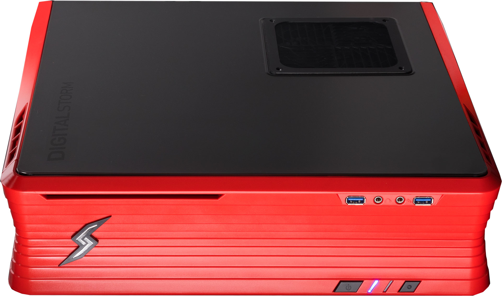"The ELCIPSE’s modest footprint (L15", W4", H14") takes up little space on a shelf or in an entertainment center in either a vertical or horizontal position. The system's chassis is constructed of reinforced plastic with a steel body. A gamer friendly design makes upgrades a snap with easily accessible components and adjustable brackets and room for extra storage. Each pre-built ECLIPSE features a full-size dedicated graphics card and desktop-class Intel processor", says Digital Storm.