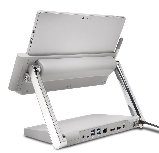 Worst of all, its most recent Surface Pro dock (seen here) is rather ho-hum. I preferred the older Surface docking station (seen here) from the Surface Pro 3 days, which cradled the tablet -- it wasn't just a glorified dongle like the current one. Seeing an opportunity to outdo Microsoft, today, Kensington unveils a Surface Studio-like docking station (model SD7000) that is downright breathtaking -- it holds up the tablet and has adjustable arms.