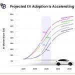 Electric Vehicle (EV) adoption is outperforming all expectations, and is now expected to represent over half of US vehicle sales by 2030, as shown in this graph.